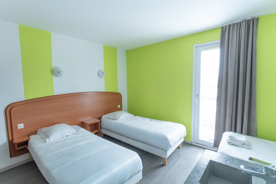 Découvrez notre chambre twin de 12m², comprenant 2 lits séparés de 80*200cm, climatisée et sa salle de bain privative.